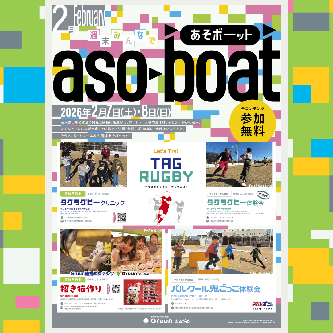 Gruun連携コンテンツ「招き猫作り」と、タグラグビーの「クリニック」は定員制の事前予約コンテンツとなります。枠が埋まる前に予約を急げー!