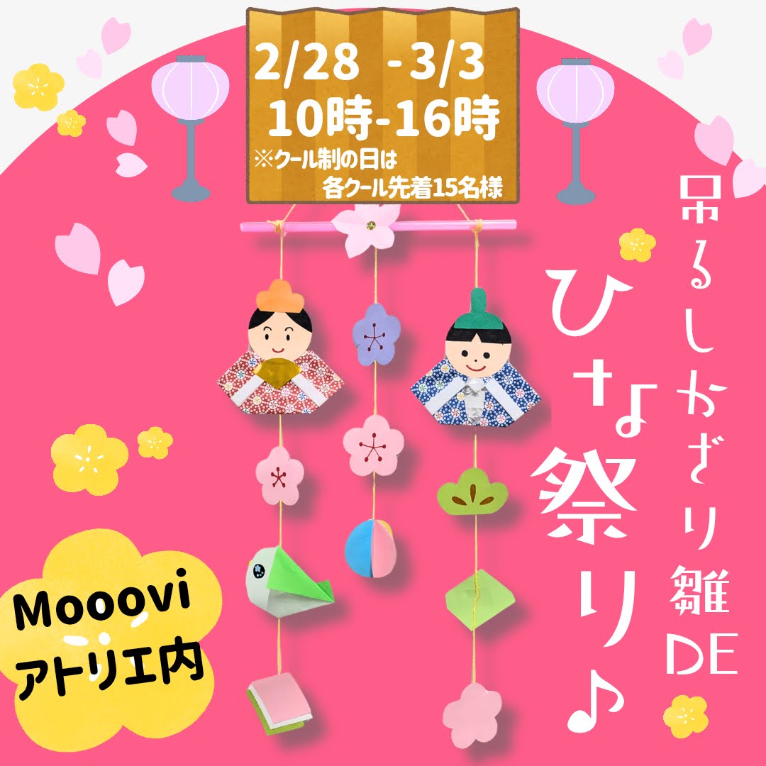 モーヴィのイベント2026.02.28《つるしかざり雛DEひな祭り🎎❤》 ⏰️2/28(土)〜3/3(火) 10:00〜16:00 📍Moooviアトリエゾーン ※クール制の日は各クール15名様 ※汚れてもよい服装でお越しください 折り紙で、うぐいすや、着物を折って吊るしかざり雛を作りませんか??ひな祭りに春らしい飾りつけをして、お家に飾りましょう🌸 🎀ご参加お待ちしてます🎀